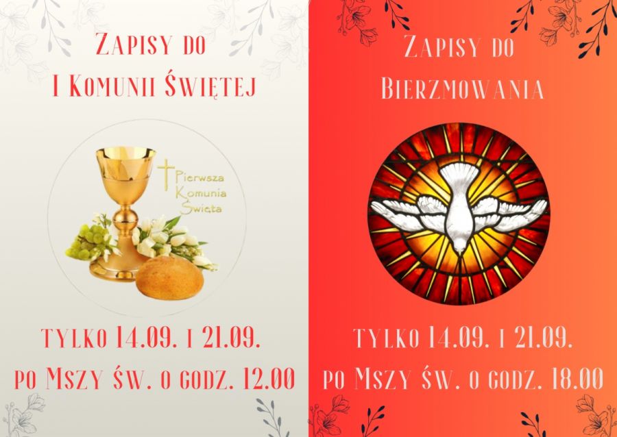 Zapisy dzieci do I Komunii św. tylko w niedziele 14 września i 21 września po Mszy św. o 1200, natomiast młodzieży do bierzmowania (I klasa szkoły ponadpostawowej) tylko w niedziele 14 września i 21 września po Mszy św. o 1800.